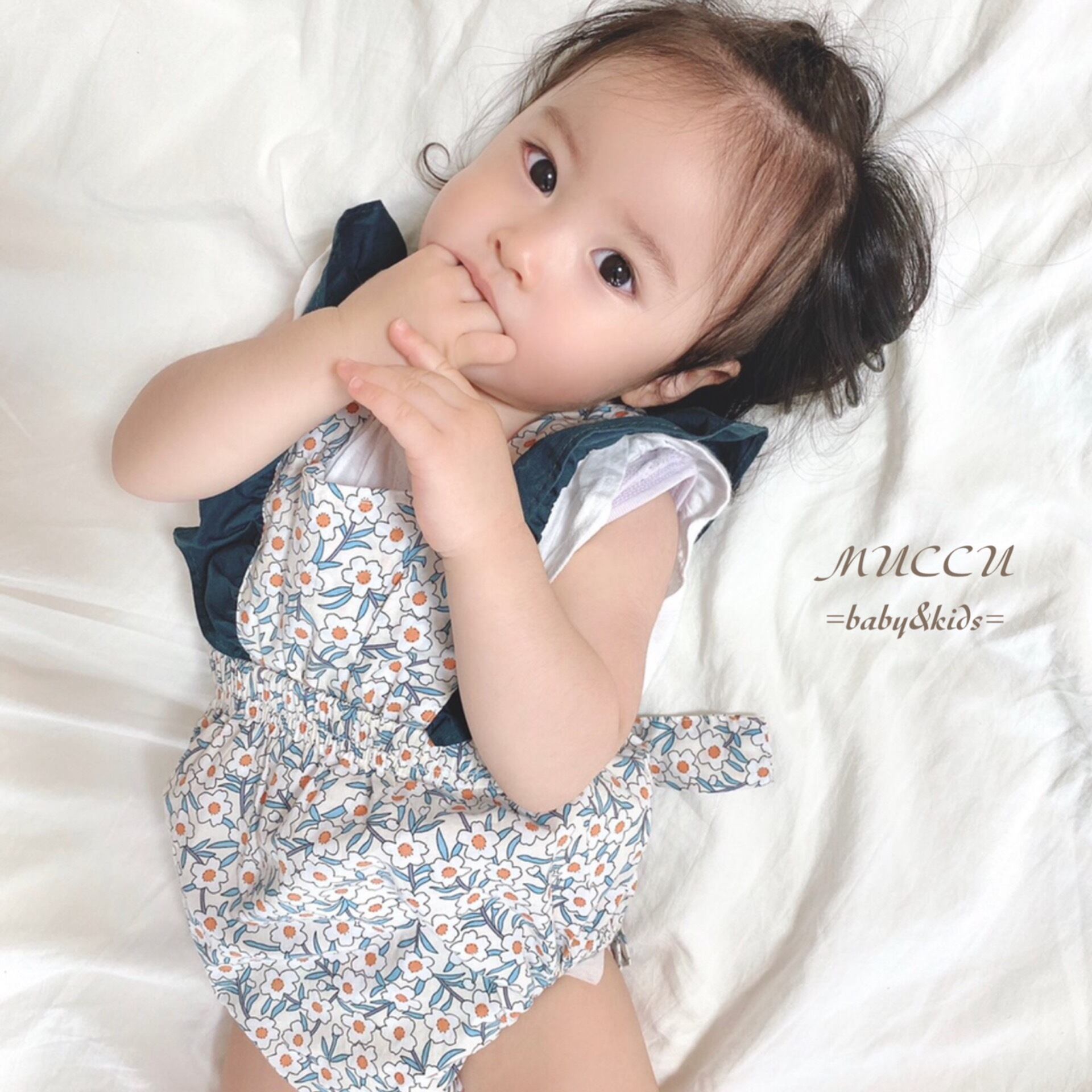 今の時期はジャンパースカートやタイツと合わせたり、夏は一枚で可愛い激かわロンパースです。