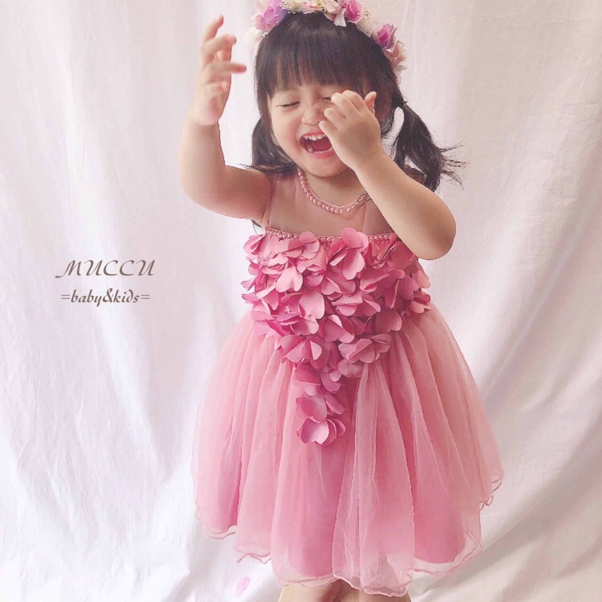 送料無料!【予約販売】可愛いすぎる♡ 特別な日に♡ ハート 花びら パール プリンセス ドレス 73cm〜110cm 女の子 姉妹 双子 お誕生日 赤ちゃん 出産祝い ハーフバースデー 結婚式 撮影会 | MUCCU =baby&kids=