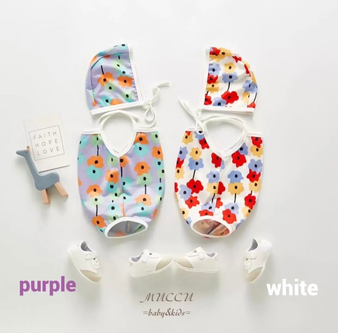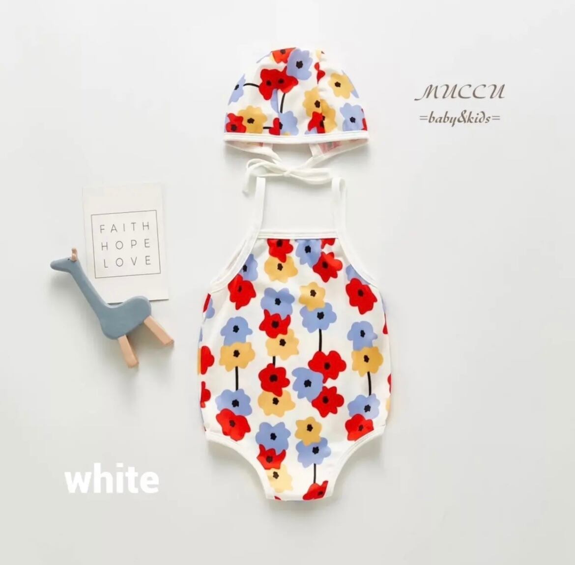 送料無料!【即納】レトロでおしゃれに♪ お花柄 水着 & 帽子 セット 90cm 女の子 姉妹 双子 ペアコーデ プール 海